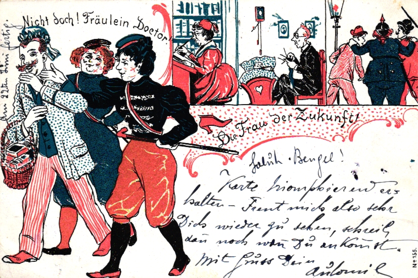 Frauen, Emanzipation „Die Frau der Zukunft“, Scherz-AK, 1901, postalisch gelaufen, kleiner Eckbug unten links, nette Karte mit nur kleineren Altersspuren.
