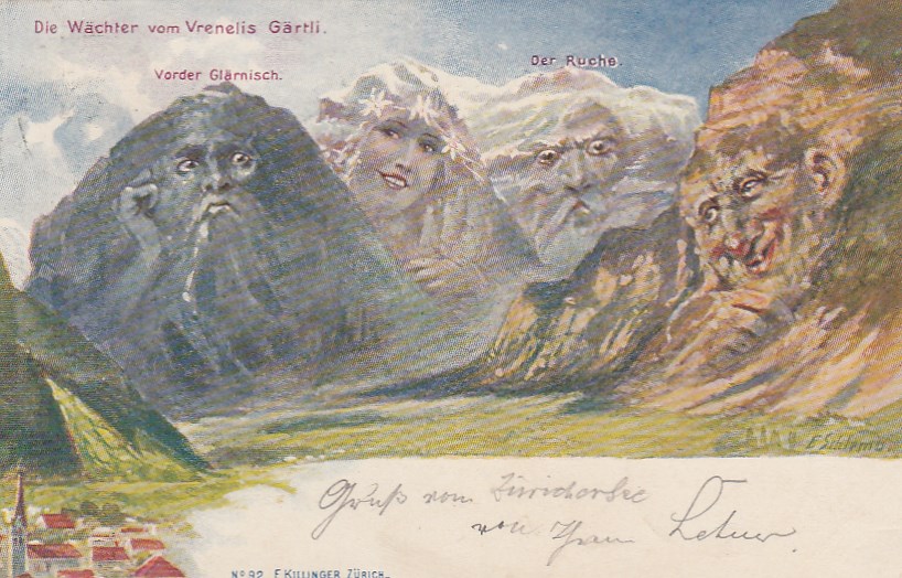 Berggesichter, Verlag Killinger Karte Nr. 92, „Die Wächter von Vrenelis Gärtli“ 1899 von Zürich nach Klosterwald / Hohenzollern versandt, nur sehr geringe Altersspuren.