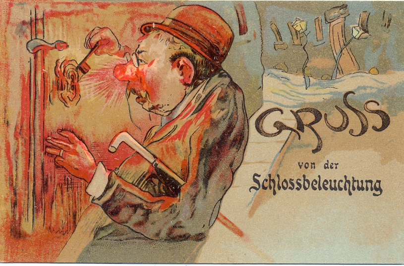 Heidelberg, „Gruss v.d. Schlossbeleuchtung“, Scherz-AK, um 1910/20, nicht beschriftet, nicht gelaufen, einwandfreie Erhaltung.
