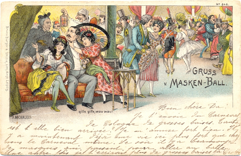 Fasching, Karneval, Gruss vom Maskenball, 1900 von Cöln nach Marchienne-au-Pont in Belgien versandt, leicht eckbestossen, zwei kleine Eckbüge, sonst ordentliche Erhaltung.