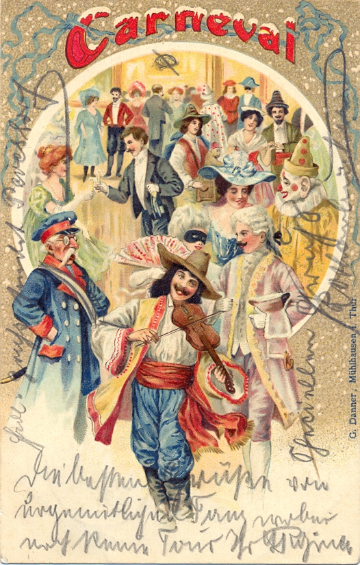 Karneval, Farb-Litho, 1908 postalisch gelaufen, Markenentwertung mit Bahnpoststempel Metz – Frankfurt am Main, versandt nach St. Wendel, besonders schöne Karte in guter Erhaltung.