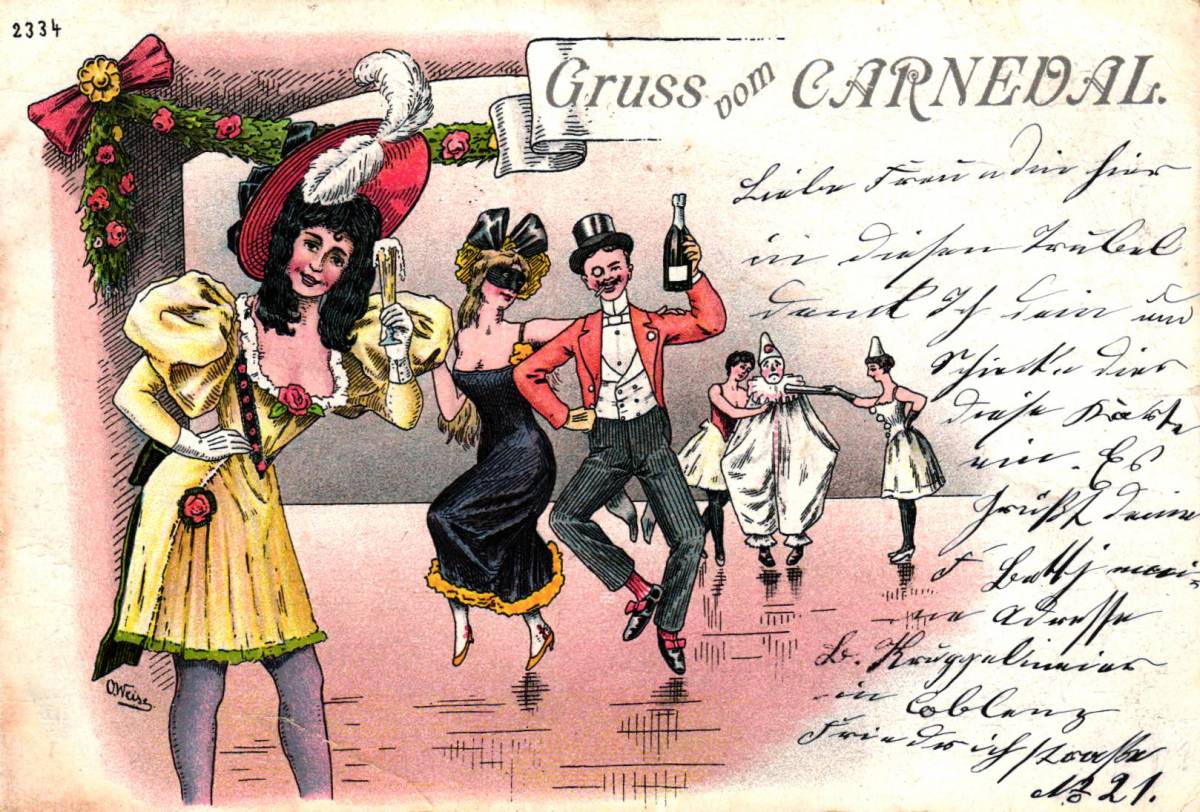 Karneval, Farb-Litho, um 1900/05, vorder- u. rückseitig beschriftet, nicht postalisch gelaufen, leicht eck- bzw. randbestossen, insgesamt aber nur kleinere Altersspuren.