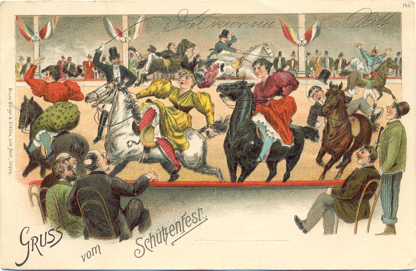 Schützenfest, Pferde, Reiter, 1897 postalisch gelaufen, winziger Eckbug, sonst nur sehr kleine Altersspuren.