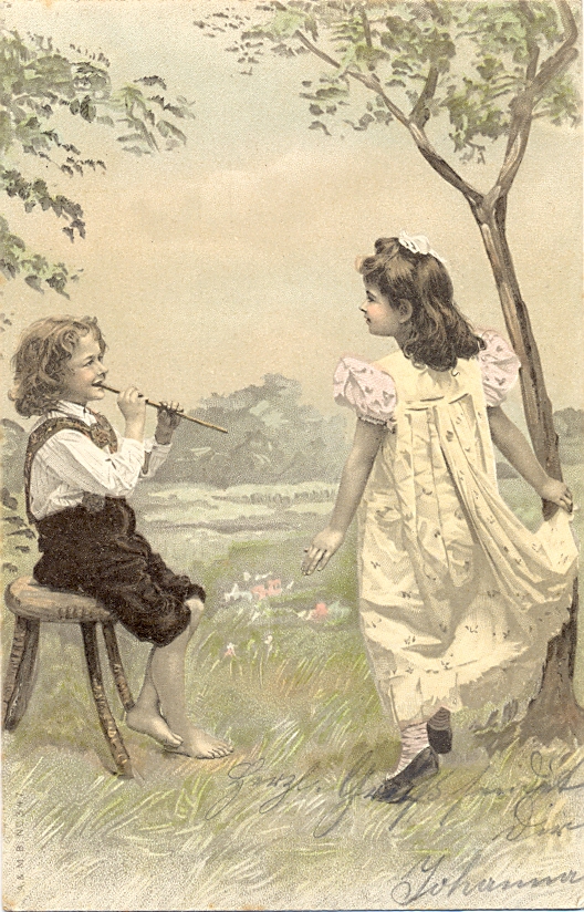 Junge mit Flöte, Mädchen, Farb-Litho, 1905 postalisch gelaufen, nur kleinere Altersspuren.