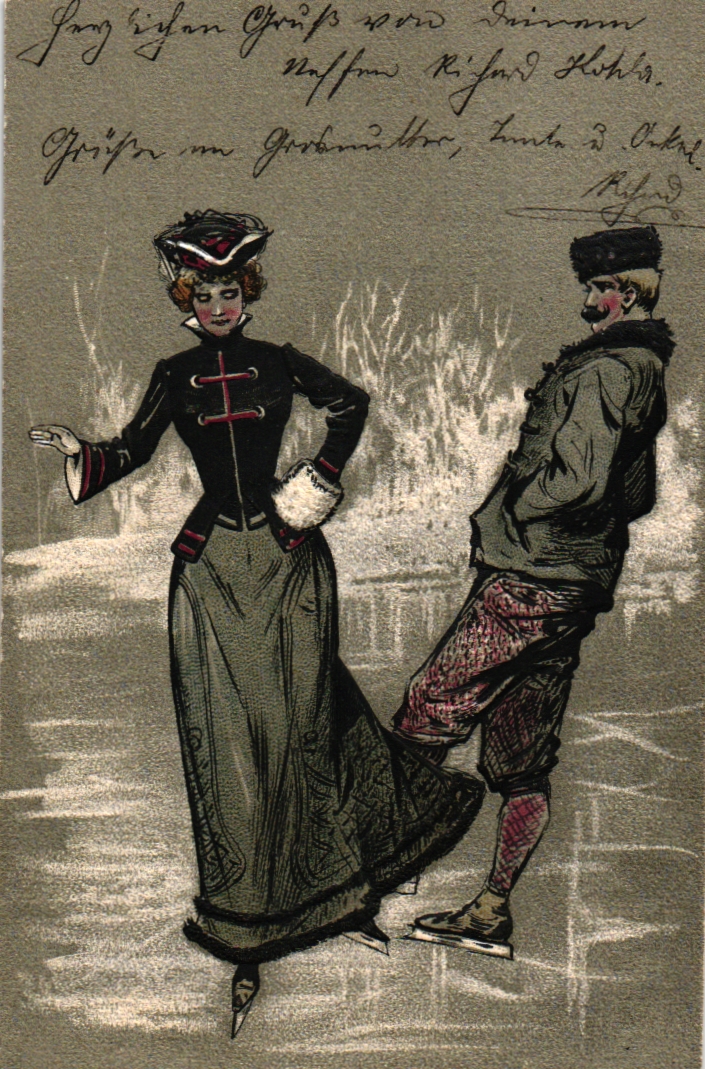 Mann und Frau mit Schlittschuhen, Prägekarte, 1903 postalisch gelaufen, nur sehr geringe Altersspuren.