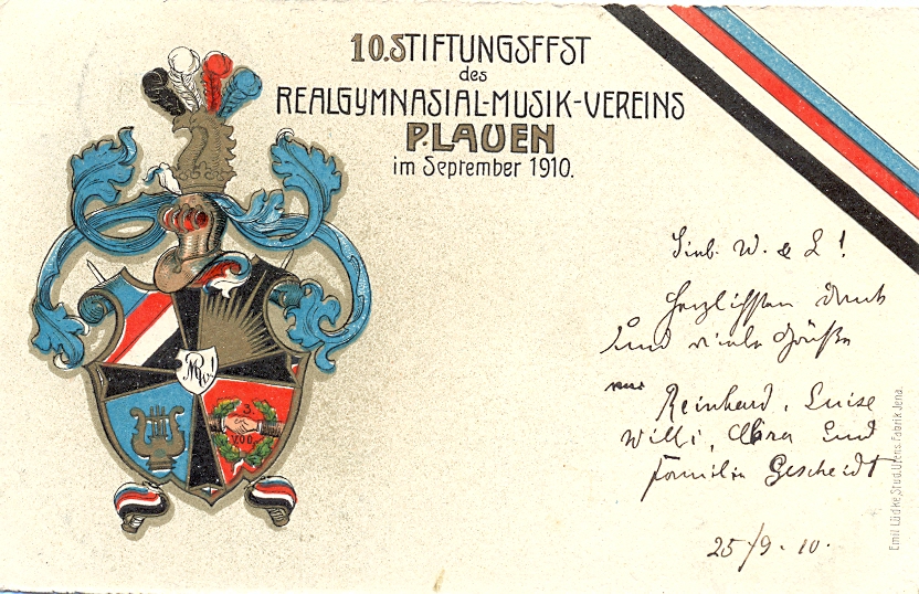 Plauen, 10. Stiftungsfest des Realgymn.-Musik-Vereines, 1910 von Plauen nach Leipzig versandt, schöne Karte in guter Erhaltung.