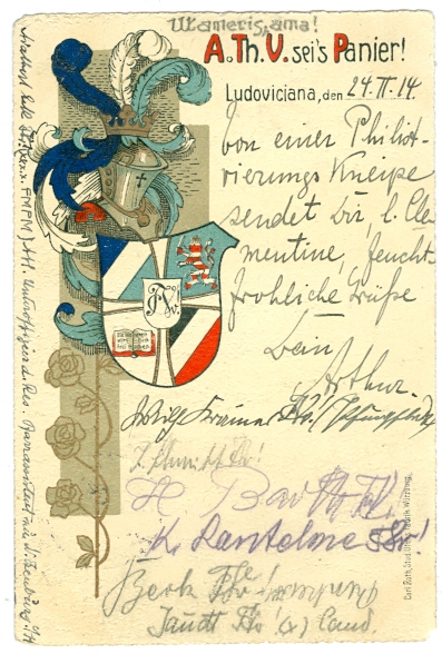 Studentika, Giessen, A.Th.V. sei` s Panier, 1914 (Ludoviciana, 24.02.14), schöne Karte mit nur kleineren Altersspuren, Ecke unten rechts herstellungsbedingt etwas stumpf.