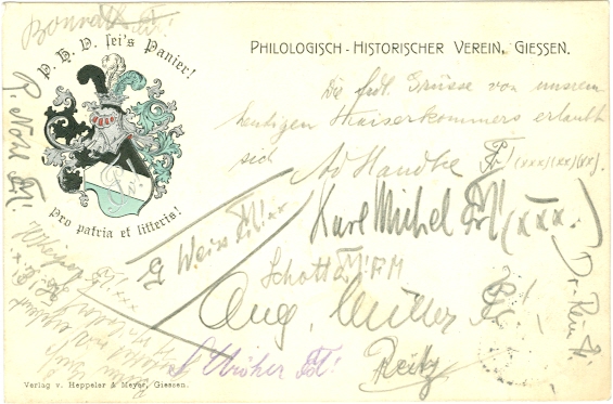 Studentika, Giessen, Philologisch-Historischer Verein, 1909 von und nach Giessen versandt, nur sehr geringe Altersspuren.