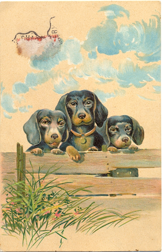 Dackel am Zaun, Prägekarte, um 1900/10 postalisch gelaufen, die vorderseitig angebrachte Briefmarke (oben links) wurde entfernt, sonst ordentliche Erhaltung.