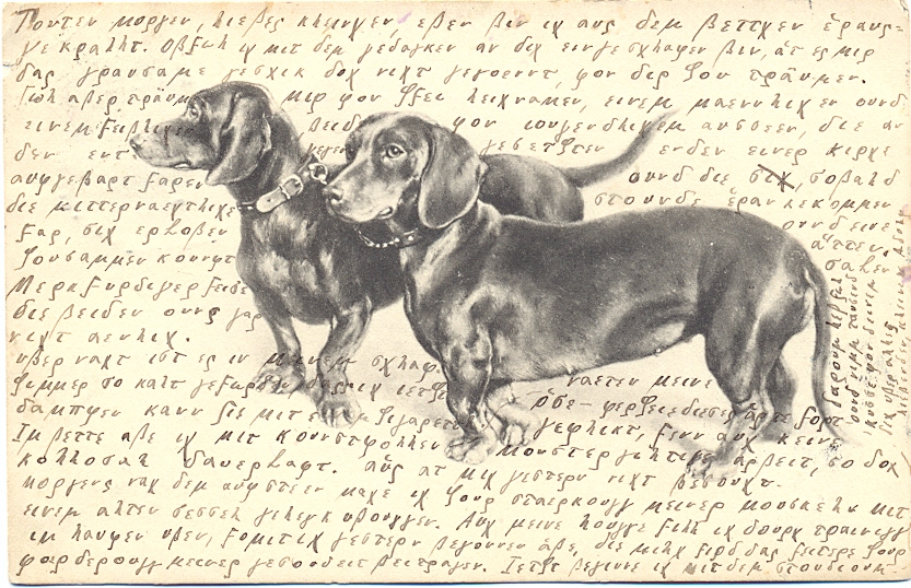 Dackel, Dackelpaar, 1902 postalisch gelaufen, oben links Eckbug, sonst ordentliche Erhaltung.