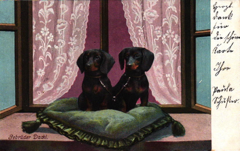 Dackel, „Gebrüder Dackl“, um 1900/05, beschriftet, nicht postalisch gelaufen, nur kleinere Altersspuren, im Unterrand leicht bestossen, Spuren etwas ausgebessert, schöne Karte in insgesamt noch guter Erhaltung.