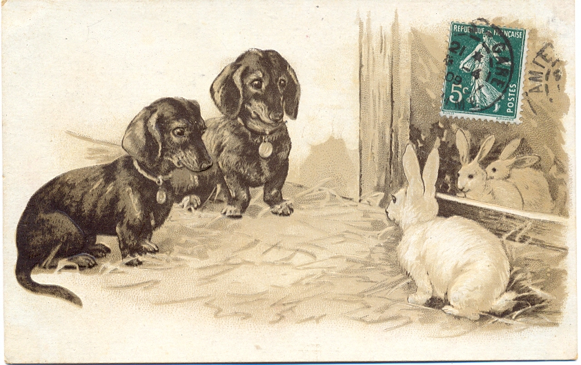 Dackel, Hasen, Prägekarte, 1909 postalisch gelaufen, nur kleinere Altersspuren.