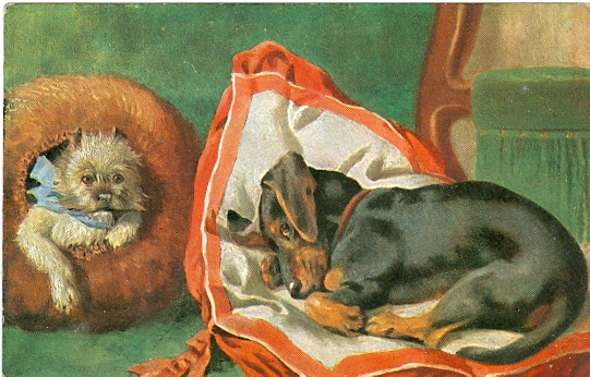 Dackel, Hunde, Kissen, Korb, 1914 postalisch gelaufen, gering eckbestossen, sonst ordentliche Erhaltung.