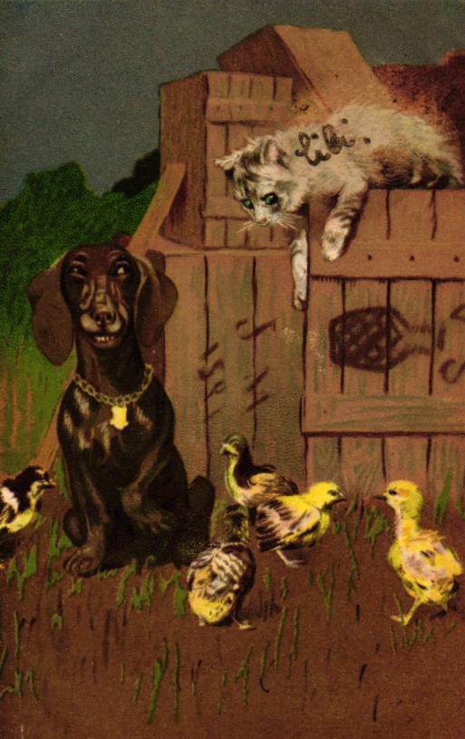 Dackel, Katze, Hühnerstall, um 1910/20, beschriftet, nicht postalisch gelaufen, nur sehr kleine Altersspuren.