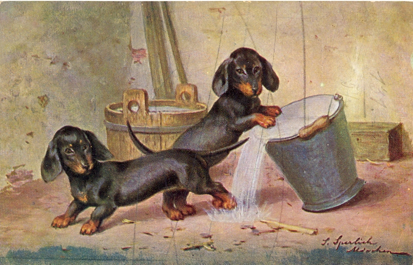 Dackel mit Eimer, um 1910, nicht beschriftet, nicht gelaufen, etwas eck- u. randbestossen, kleinere Altersspuren.