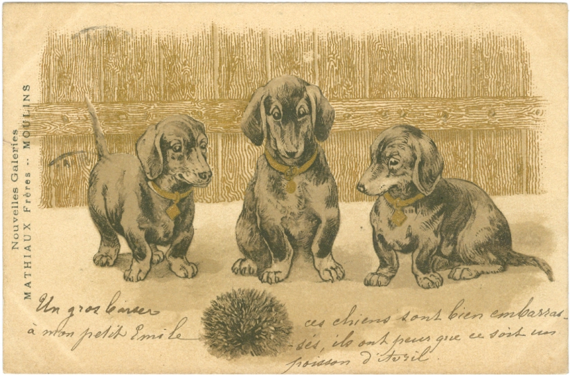 Dackel mit Igel (?), 1904, postalisch gelaufen, unten links Eckbug, an den Ecken etwas Spuren der ehemaligen Albumbefestigung.