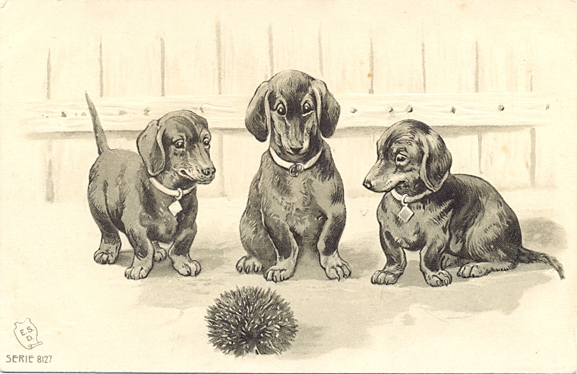 Dackel mit Igel, Prägekarte, um 1900/10, nicht beschriftet, nicht gelaufen, nur sehr kleine Altersspuren.