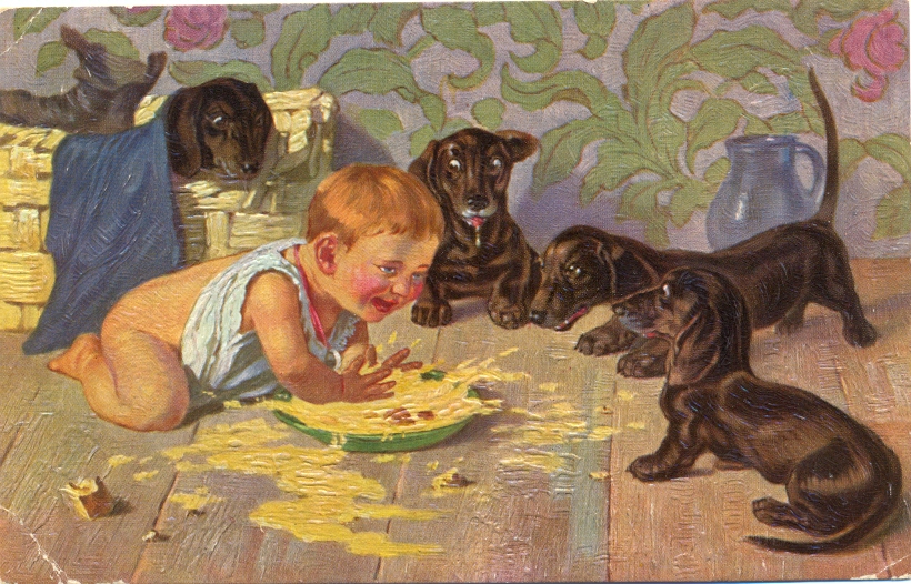 Dackel mit Kind, 1931 postalisch gelaufen, Karte in Gemälde-Optik, kleine Eckbüge, sonst noch ordentliche Erhaltung.