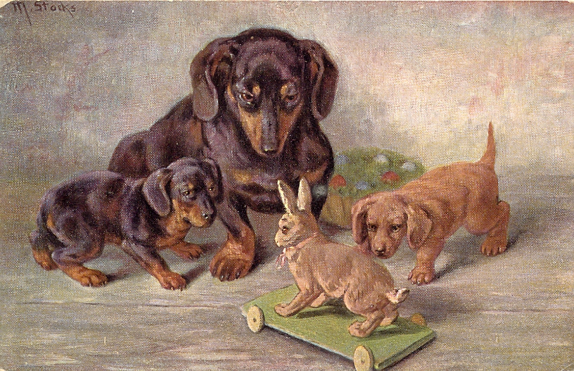 Dackel mit Spielzeughase, sign. Stocks, um 1900/10, nicht beschriftet, nicht gelaufen, etwas eckbestossen, kleinere Altersspuren.