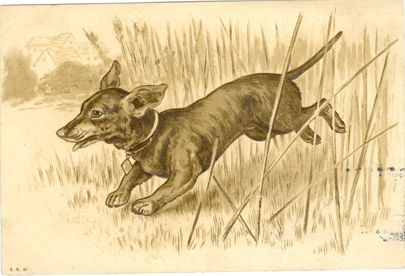 Dackel, Prägekarte, 1902 postalisch gelaufen, oben links kleiner Eckbug, sonst ordentliche Erhaltung.