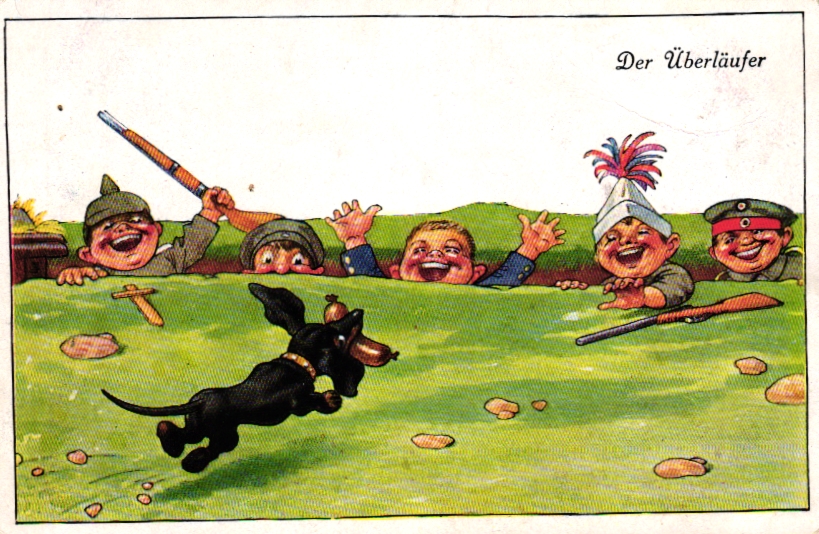 Militär, Humor, Dackel stiehlt eine Wurst, „Der Überläufer“, um 1915/20, nicht beschriftet, nicht gelaufen, kleinere Altersspuren, jedoch sammelwürdige Erhaltung.