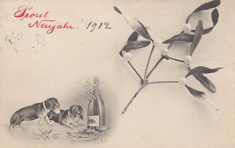 Neujahr, Dackel mit Sektflasche, 1911 postalisch gelaufen, gering Stempelspuren vorderseitig, winziger Eckbug oben rechts, kleine Altersspuren.