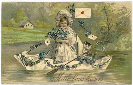 Katze, Mädchen, Boot, Prägekarte, um 1910, rückseitig beschriftet, nicht postalisch gelaufen, nur sehr geringe Altersspuren.