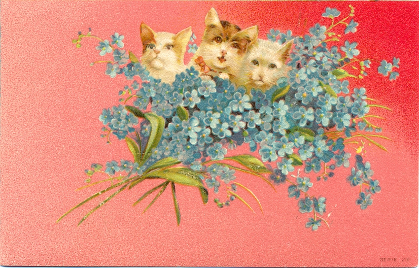 Katzen mit Vergissmeinnicht, Farb-Litho, um 1900/10, nicht beschriftet, nicht gelaufen, nur winzige Altersspuren.