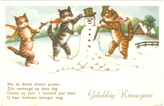 Neujahr, Katzen bauen einen Schneemann, 1953 postalisch gelaufen, nur sehr geringe Altersspuren.