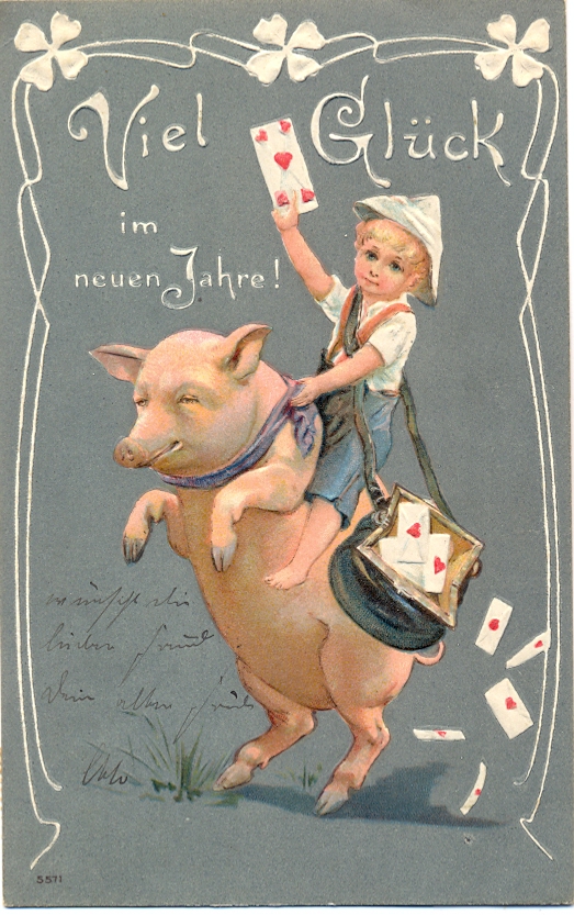 Neujahr, Schwein, Kind, Prägekarte, 1905 postalisch gelaufen, sehr schöne Karte mit nur winzigen Altersspuren.