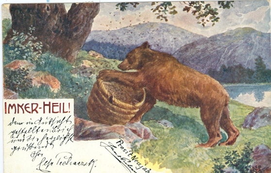 Honig, Imker, Bienen, „Imker Heil“, Bär stielt Honig, um 1910, postalisch gelaufen, seltenes Motiv, gering eckbestossen, sonst ordentliche Erhaltung.
