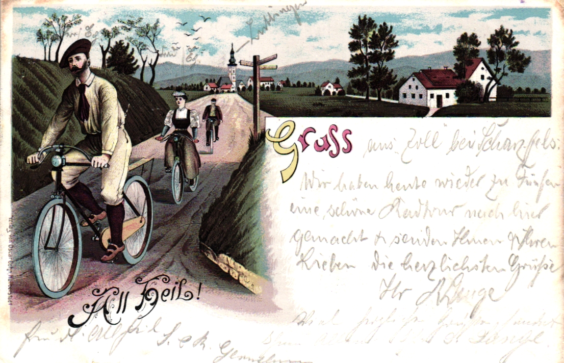 Fahrrad, Fahrradfahrer „All Heil“, Farb-Litho, 1900 postalisch gelaufen, Markenentwertung mit Bahnpoststempel Nordhausen – Paderborn, versandt nach Kleinlaufenburg, oben rechts etwas eckbestossen, unten links zwei sehr kleine Randkerben, insgesamt noch gute Erhaltung.