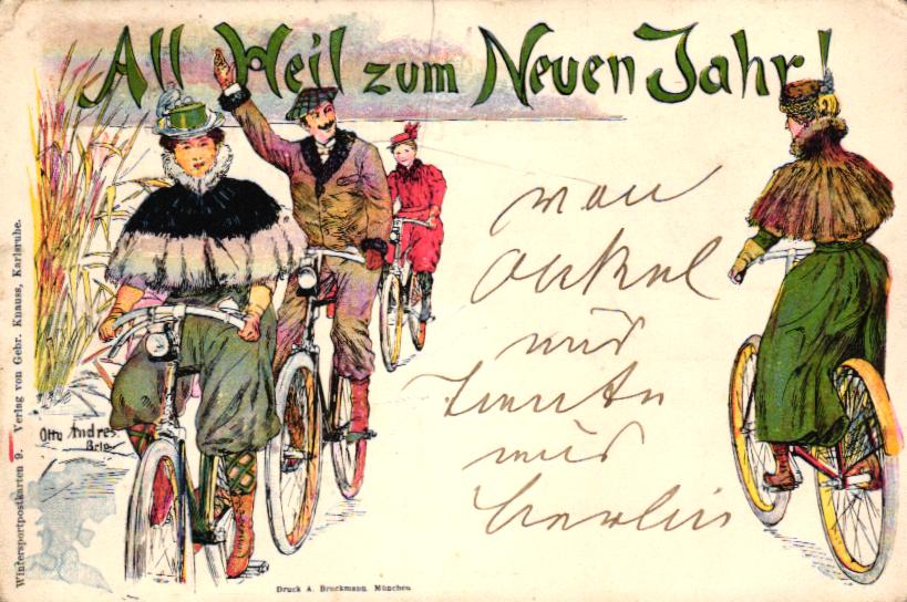 Fahrrad, Radfahrer, Farb-Litho „All Heil zum Neuen Jahr“, 1899 von Berlin nach Kiel versandt, kleiner Eckbug oben links, kleinere Altersspuren, als Neujahr-AK sind diese Motive nicht sonderlich häufig.