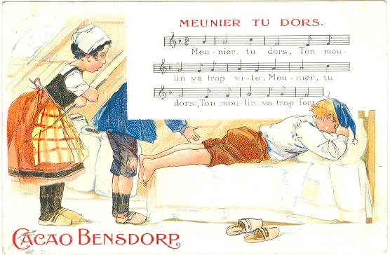 Cacao Bensdorp, Werbe-AK, Farb-Litho, 1908 postalisch gelaufen, oben rechts leichter Eckbug, an den Ecken etwas Druckspuren der ehemalign Albumbefestigung, etwas Stempelspuren vorderseitig.