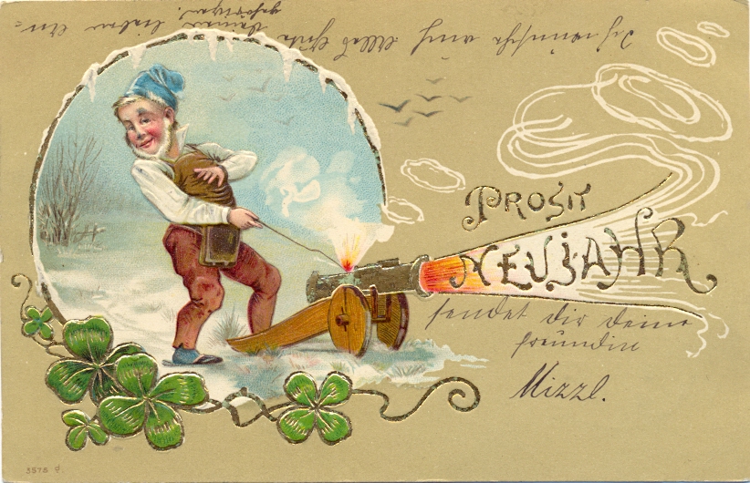 Neujahr, Zwerg mit Kanone, Prägekarte, 1902 postalisch gelaufen, nur sehr kleine Altersspuren.