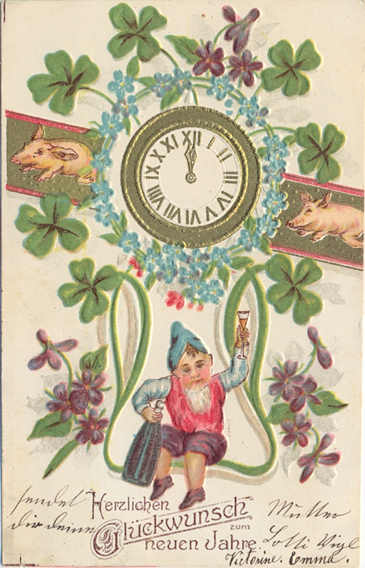 Neujahr, Zwerg, Uhr, Schweine, Prägekarte, um 1900/05 postalisch gelaufen, kleiner Eckbug unten links, sonst ordentliche Erhaltung.