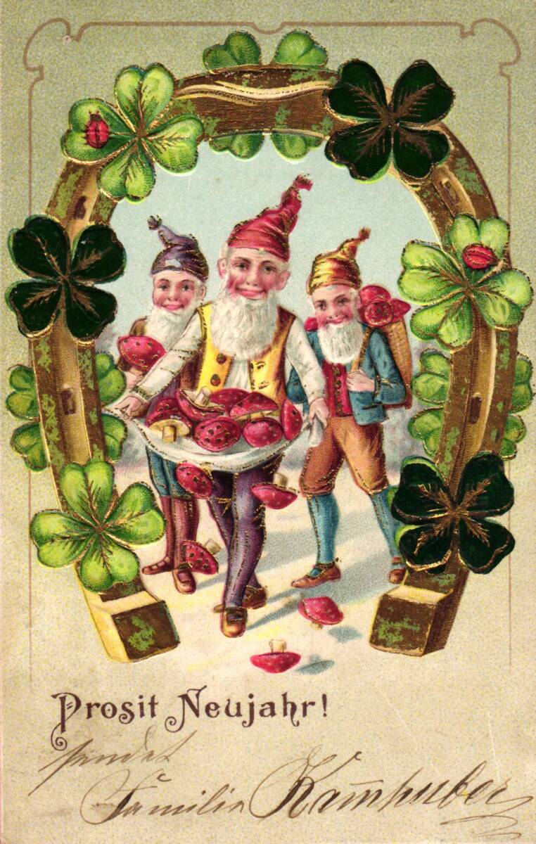 Neujahr, Zwerge, Fliegenpilze, Prägekarte, 1906 postalisch gelaufen, winziges Nadelloch oben links, sonst schöne Karte in guter Erhaltung.