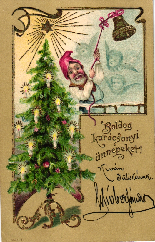 Weihnachten, Zwerg mit Glocke, Prägekarte, 1901 in Budapest versandt, schöne Karte, winzig eckbestossen, sonst einwandfreie Erhaltung.