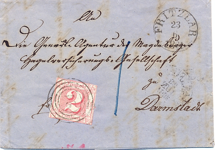 Thurn u Taxis, Brief aus Fritzlar „21“ nach Darmstadt, 1861, frankiert mit Michel Nr. 16, Sem-Bewertung = 125.- + 45.- EURO.