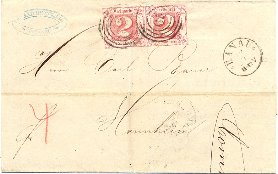 Thurn u Taxis, Bf. aus Hanau nach Mannheim, frankiert mit 2x Michel Nr. 16 (4 SGr = Brief der zweiten Gewichtsstufe), Marken gering berührt, Faltspur leicht durch die linke Marke gehend. Sem-Bewertung = 195.-