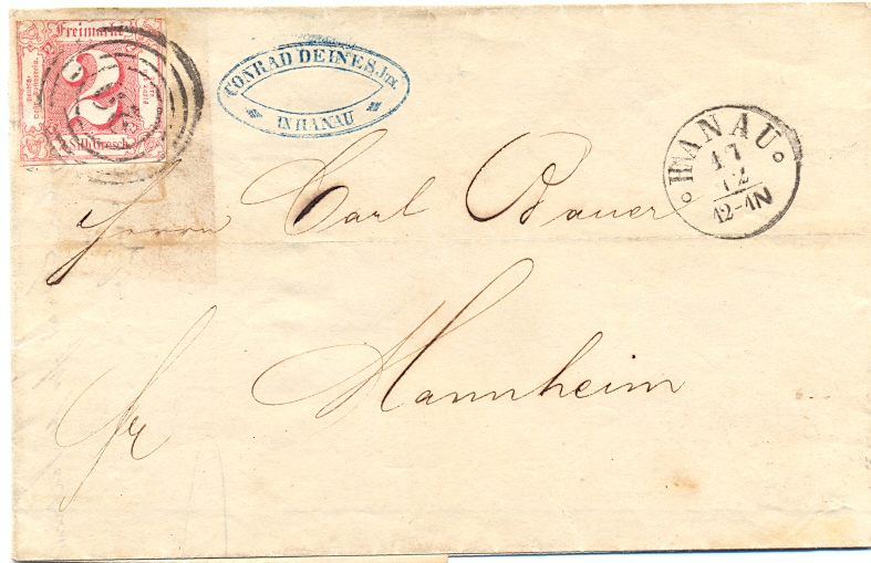 Thurn u Taxis, Bf. aus Hanau nch Mannheim, frankiert mit Michel Nr. 16, Marke dreiseitig vollrandig, oben berührt, Brief im Bereich der Briefmarke etwas unsauber. Sem-Bewertung = 135.- EURO