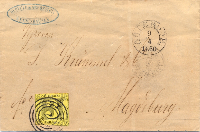 Thurn u Taxis, Brief aus Abterode „1“, Michel Nr. 6, Postvereinsbrief nach Magdeburg, schöner Stempelabschlag des Ring-Nummern-Stempels „1“, Sem-Bewertung = 40.- + 150.- EURO Stempelzuschlag.