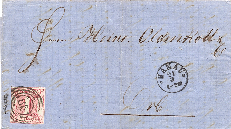 Thurn u Taxis, Brief aus Hanau nach Orb (Bad Orb), frankiert mit Michel Nr. 29, Marke dreiseitig breitrandig, links berührt, klarer Ortsstempel von Hanau, rückseitig Ankunftsstempel (bayerischer Stempel) von Orb, obwohl beide Orte im heutigen Main-Kinzig-Kreis liegen, ist diese Destination nicht sehr häufig anzutreffen.