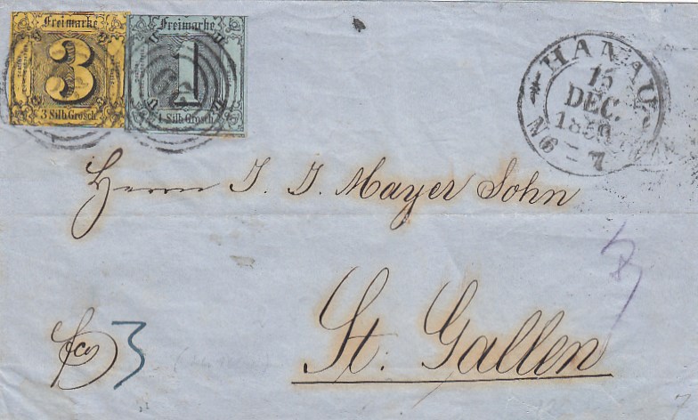 Thurn u Taxis, Brief aus Hanau nach St. Gallen, frankiert mit Michel Nr. 6 + 11, Postvereins-Auslandsbrief vom 15. Dezember 1859, taxiert mit 3 SGr Postvereinsanteil in der 1. Gewichtsstufe bei mehr als 20 Meilen Entfernung + 1 SGr fremdes Porto in den 1. Schweizer Rayon, hübscher Brief, geprüft Dr. Sommer.